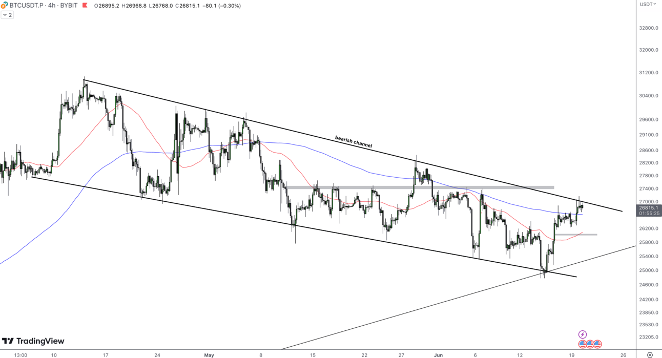 BTC is currently flirting with the top of the bearish channel as shown on the chart below. This is a crucial point for BTC, as we look to see if we can break the downtrend.